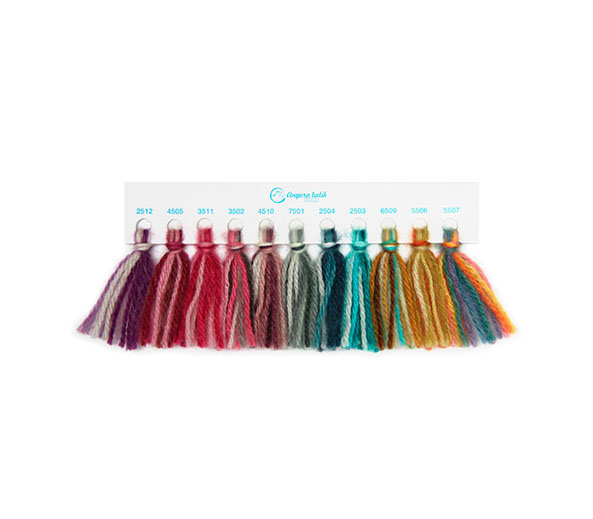 Lana compuesta por una mezcla de fibra acrílica y angora, torcida en dos cabos y teñida en degradé en una variedad de colores. Durante el proceso de producción la lana es tratada para obtener un acabado suave al tacto a la vez que obtiene una consistencia ligera. La presencia de la fibra natural de angora le proporciona una apariencia fina, añadiendo valor a las prendas confeccionadas con Angora Batik.