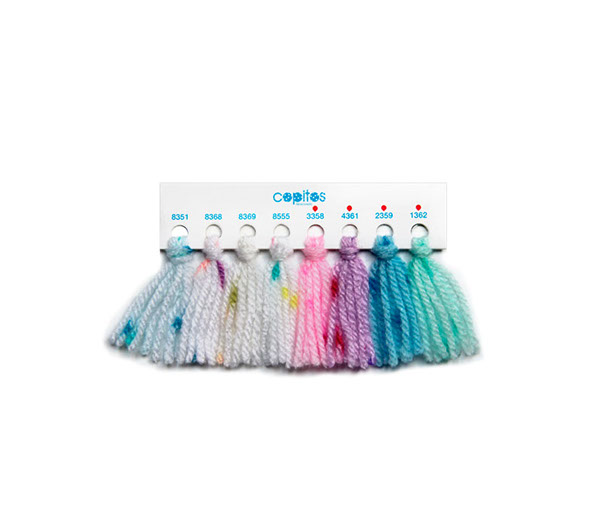 Lana compuesta por fibra acrílica, torcida en tres cabos y teñida en un color entero con chispitas multicolores. La lana Copitos tiene un acabado especial debido a su teñido creativo que produce prendas divertidas. Se caracteriza por su facilidad para tejer debido a su grosor y por ser abrigadora, sin ser demasiado pesada o gruesa.